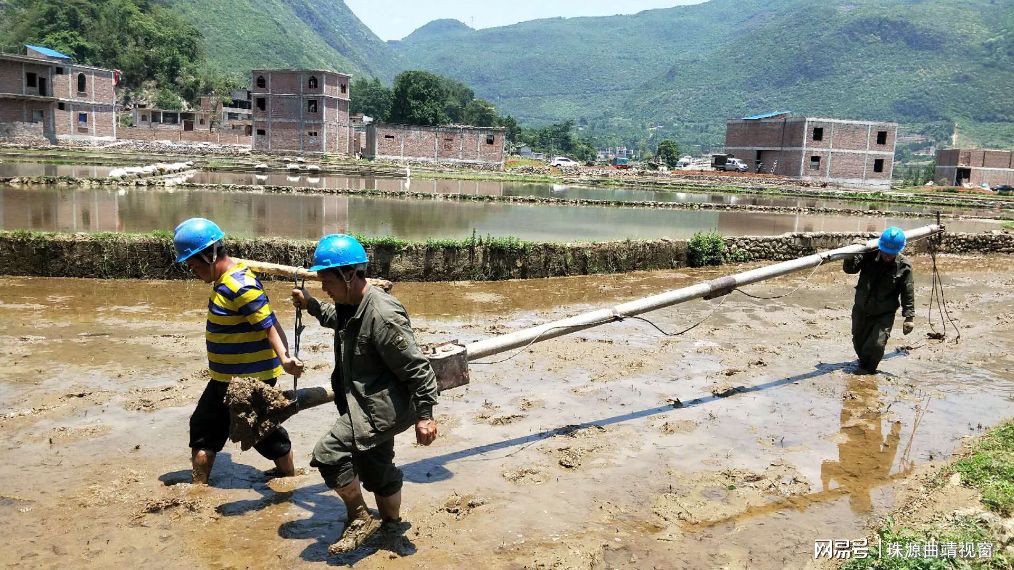 條件限制,在泥濘的田里人工搬運(yùn)電桿